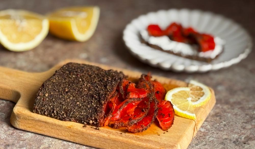 Для ценителей японской кухни. Филе нерки замариновано в соевом соусе со специями и лаймом, покрыто черным перцем и поджарено на сильном огне. Все, что Вам нужно — это разморозить продукт, тонко нарезать и подать в качестве основного блюда, которое будет идеально сочетаться с зеленью, авокадо и рисом, или сделать украшением праздничного стола в качестве холодной закуски.Замороженный продукт, готов к употреблению после размораживания.